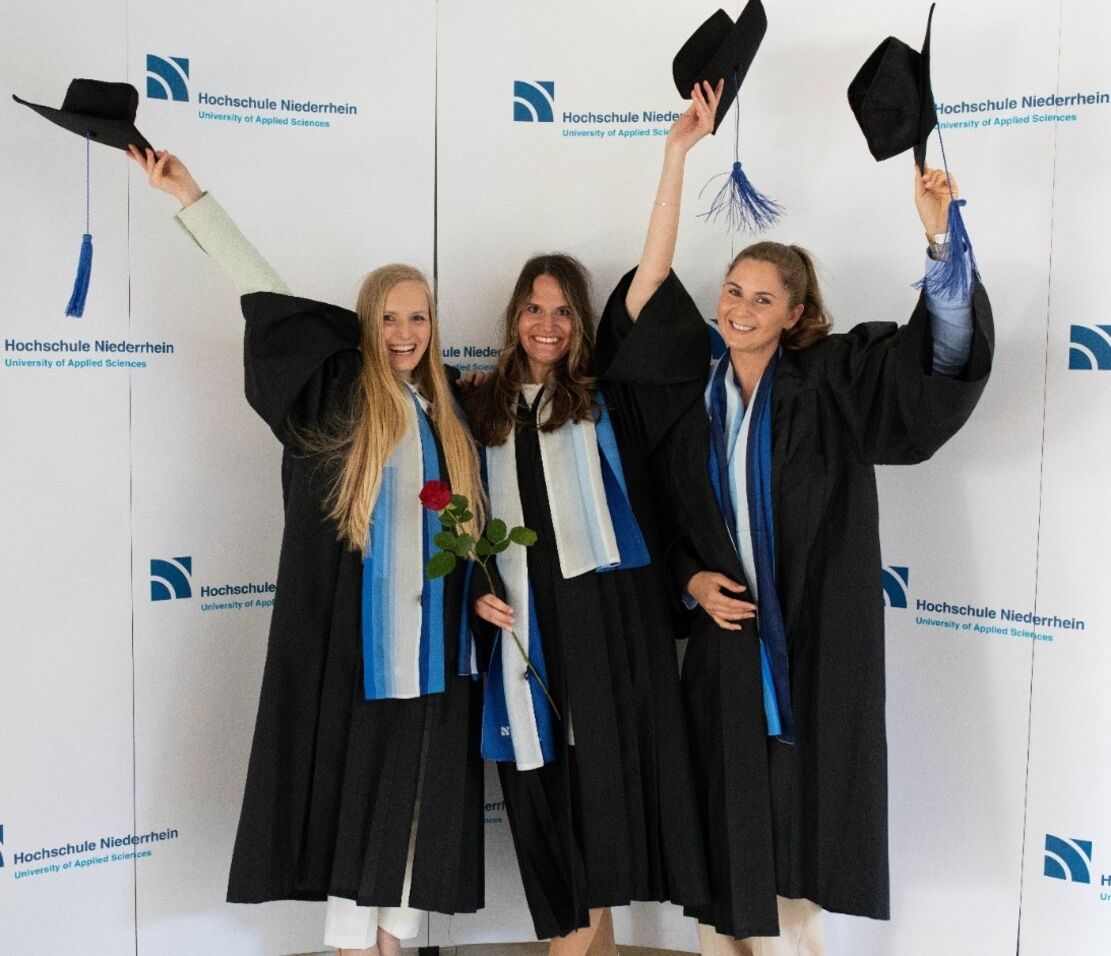 wir alle freuen uns darüber, dass wir wieder mehr Freiheiten haben und Zusammenkünfte, Restaurantbesuche und Veranstaltungen gemeinsam erleben und genießen dürfen. Mein persönliches Highlight dabei sind die wieder gestarteten Abschlussfeiern, bei denen ich als Fotografin vor der Hochschullogowand glückliche Absolventinnen und Absolventen, stolze Eltern, Familienangehörige und Freunde ablichte. Ungewohnt ist für mich dabei der physische Kontakt zu den zu fotografierenden Personen. Seit Corona gehen wir schließlich alle lieber auf Abstand. Aber jetzt ermuntere ich nicht nur mit „bitte lächeln“ und „das geht aber noch netter“, sondern ermahne, dass die Brille hochgeschoben werden muss, der Talar zugeknöpft sein sollte und man in die Kamera blicken sollte. Und viele Male nehme ich dann den direkten Kontakt auf, natürlich mit Erlaubnis der Absolventin oder des Absolventen und zupfe den widerwilligen Talar zurecht, sorge dafür, dass der Schal gleichmäßig lang auf beiden Seiten ist und der Hut richtig sitzt. Und ich freue mich über die schönen Erinnerungsbilder, die die Absolventinnen und Absolventen an ihren Abschluss erinnern. Viel Spaß mit Euren Fotos und Euren Erinnerungen an die Hochschule Niederrhein.