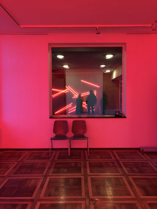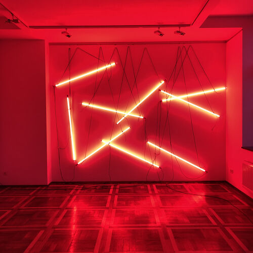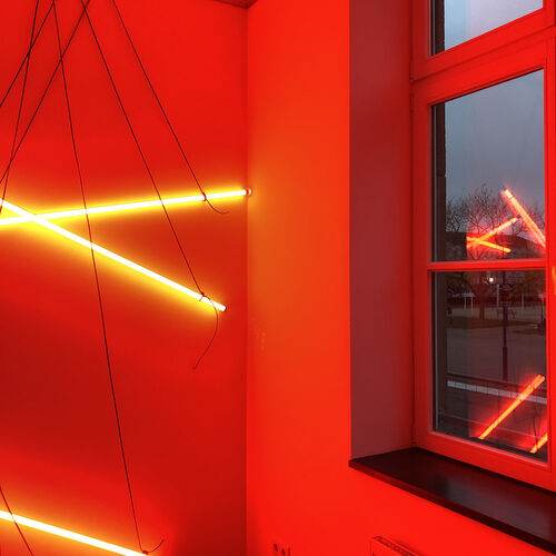 Mit  handelsüblichen Leuchtröhren, Stromkabeln und Licht verwandelt Kim Jakob Lares den Raum in ein chaotisches Kunstwerk. Licht und Raum kollidieren atmosphärisch. Die Ausstellung macht Kunst greifbar und so wird die betrachtende Person in Licht getaucht und Teil der Installation.