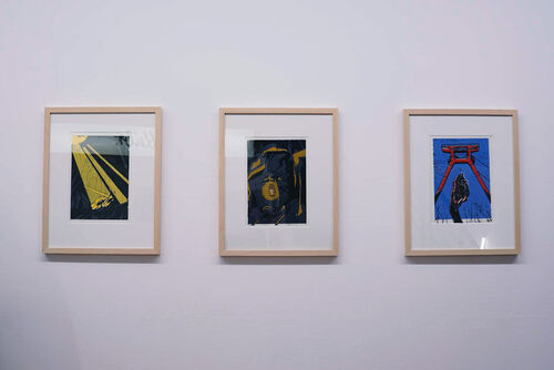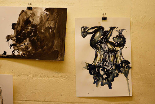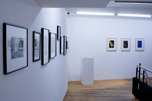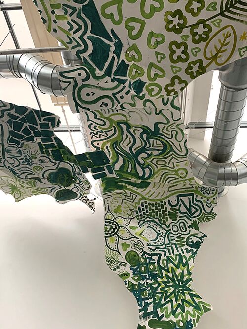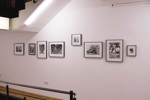 Außerdem waren drei mehrfarbige Linolschnitte von Jessica Bayerlein zu sehen, frisch aus der Druckwerkstatt. Carolin Hinse bespielte zwei gegenüberliegende Wände mit mehreren Tuschezeichnungen und einer für den Raum angefertigten drei Meter langen Papierarbeit: Aus einer Lüftungsanlage wuchsen blätterartige Formen über die Wand und den Boden entlang.