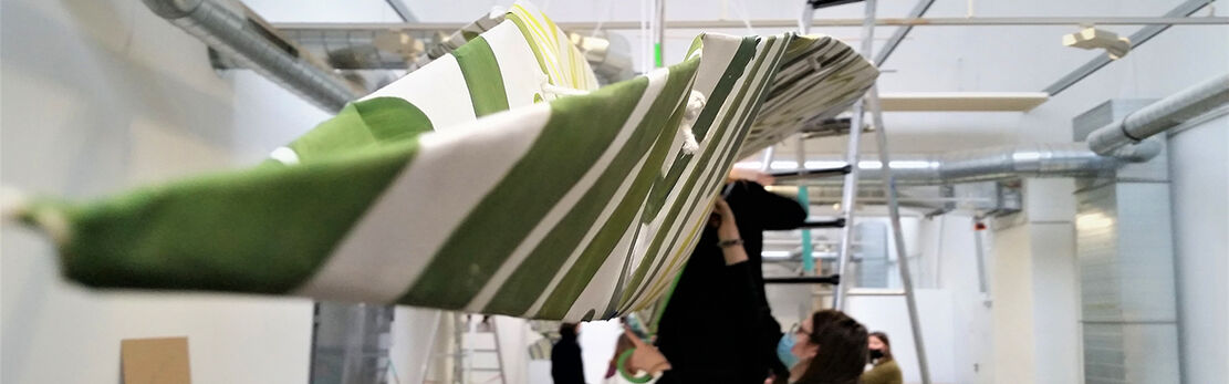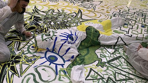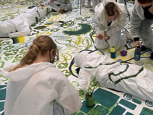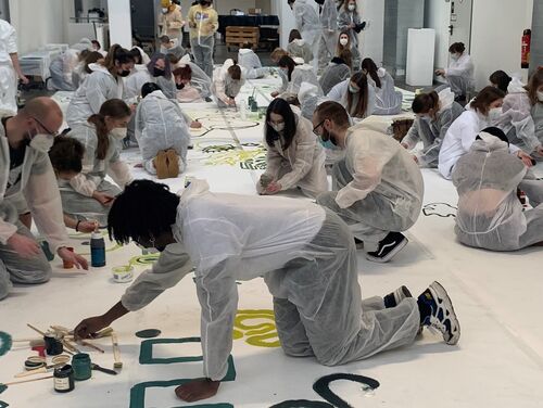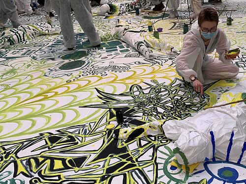 Nach zweijähriger Pause hat sich unsere Shedhalle endlich wieder in eine große Atelierwerkstatt verwandelt. Mathias Lanfer und Prof. Susanne Specht boten mit dem 2-tägigen Kompaktseminar eine kreative Zone an, in der eigenverantwortlich und ergebnisoffen gearbeitet wurde. Analog gemischte Grüntöne wurden von den Studierenden in eine riesige Bodenzeichnung mit vielfältigen Mustern und Strukturen umgesetzt. Die malerische Aufgabe war es, sich mit dem Bodenmuster bis zur „Unsichtbarkeit“ zu verschmelzen, um anschließend daraus Videos zu erstellen.