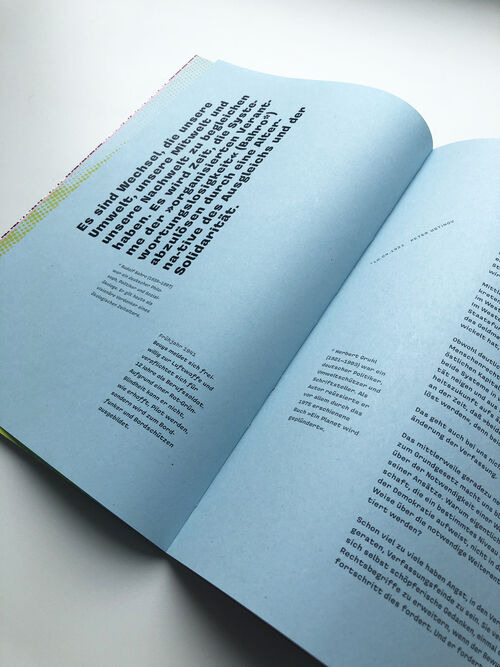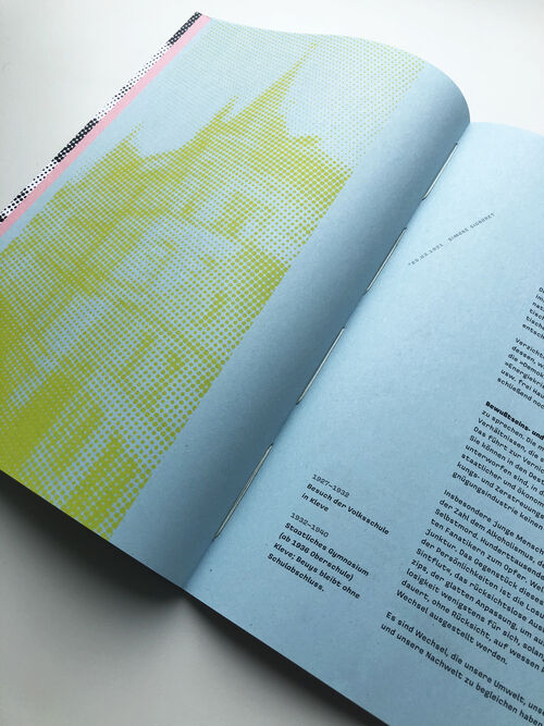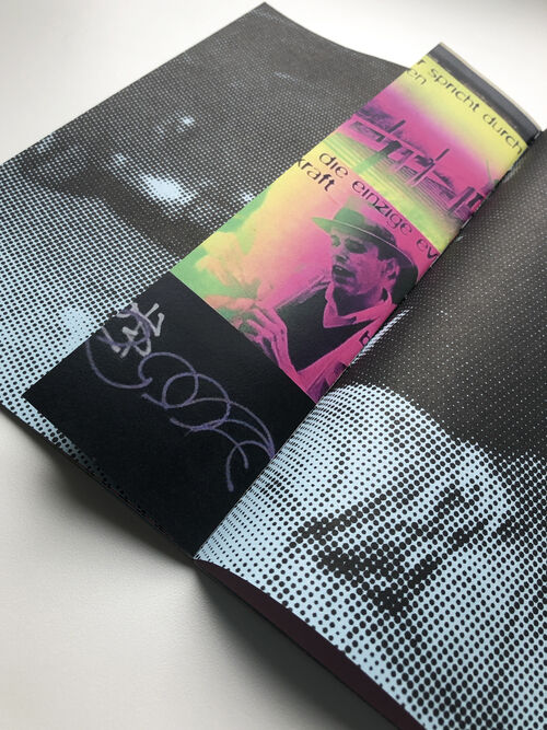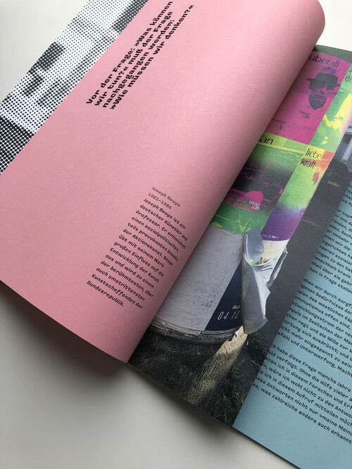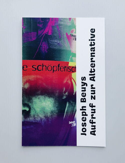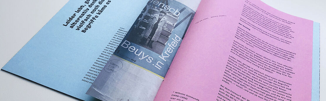 Dass der Fachbereich Design der Hochschule Niederrhein nun dennoch anlässlich des 100jährigen Beuys Jubiläum eine Broschüre publizierte, verdanken wir dem engagierten Team der Druckwerkstatt – Prof. Nora Gummert-Hauser gestaltete das 48-seitige Heft, Dr. Dan Reynolds und Dipl. Des. Thomas Junold druckten die Auflage von 100 im Digitaldruck- und Riso-Druckverfahren, im Team wurde gefalzt und zusammengetragen und Dipl. Des. Stefanie Schweers hat die Handheftung der Broschüren übernommen.