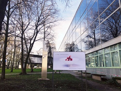 Seit Beginn des Wintersemesters 21/22 steht unsere Plakatwand »CAKE« auf dem Fachbereichsgelände am Frankenring (Ecke Hagerweg). Auf 1,75 x 1 m präsentieren wir im fliegenden Wechsel die vielfältige Kreativität des Fachbereichs Design.