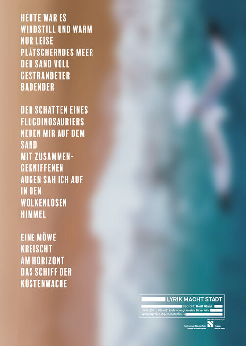 Im Kurs »Grafik Design« von Thomas Klefisch entstanden im Sommersemester 2021 in Zusammenarbeit mit dem Niederrheinischen Literaturhaus der Stadt Krefeld Plakate zu dem ersten Festival »Lyrik macht Stadt«. Ausgewählte Gedichte sollten mit Hilfe von Plakaten in der Stadt Krefeld sicht- und damit lesbar gemacht werden.