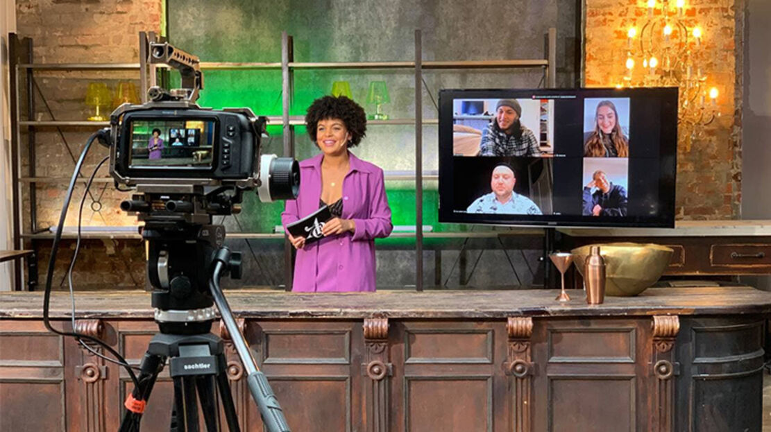 Foto: ADC-Talent-Show-Moderatorin Daphne Sagner gratuliert den designkrefeld Studierenden zum Grand Prix.