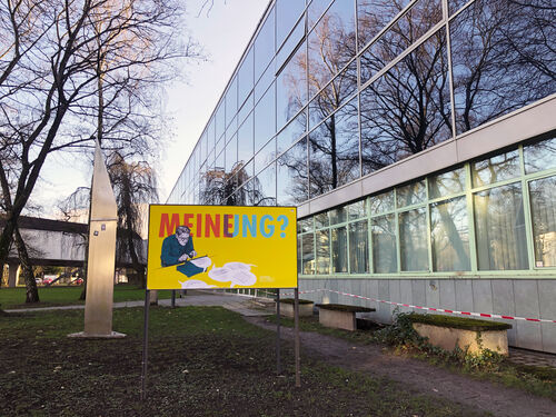 Übrigens, der Name »cake« leitet sich aus der Form unserer Plakatwand ab. Konstruktiv erinnert sie an ein Tortenstück, was den einfachen Vorteil hat, dass immer gleichzeitig zwei Arbeiten präsentiert werden können. Das jeweils aktuellste auf der Vorderseite in Richtung Frankenring, der entsprechende Vorgänger:innenentwurf auf der Rückseite in Richtung Fachbereichsgelände. So bleiben uns alle Entwürfe trotz des dreiwöchigen Wechsels immer sechs Wochen erhalten.