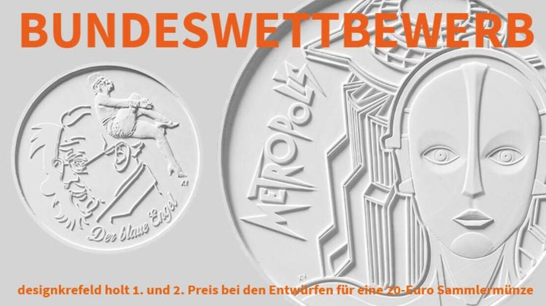Vom BVA _Bundesverwaltungsamt / Münze Deutschland wurde 2020 für die Gestaltung einer 20 Euro-Münze ein bundesweiter Hochschulwettbewerb mit dem Thema »DEUTSCHE FILMKUNST« ausgelobt. Fünf bekannte Filme aus dem Filmportal der Deutschen Kinemathek standen zur Auswahl. Von designkrefeld nahmen zwei Studierende diese arbeitsintensive Herausforderung an und hatten vollen Erfolg: Tobias Winnen gewann den 1. Preis mit »Metropolis« und Paul Liebrecht den 2.Preis mit »Der blaue Engel«.