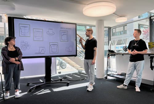 Gemeinsam zu einem Ergebnis – unter diesem Motto haben sich 11 Studierende in Teamarbeit einer gemeinsamen Aufgabe gestellt. Wie sieht die Tasse für das Future Work Lab aus, dem neuen Co-Working-Space und Veranstaltungsort der Hochschule Niederrhein? Bei der Gestaltung galt es, die Werte der Hochschule sowie das Thema Future Work formal aufzugreifen und gleichzeitig gastronomische Anforderungen zu erfüllen. Dieses Projekt markiert den Auftakt des Lehrformats Designbüro 02, das auch in kommenden Semesterprojekten mit realen Aufträgen Berufsrealitäten erlebbar macht.