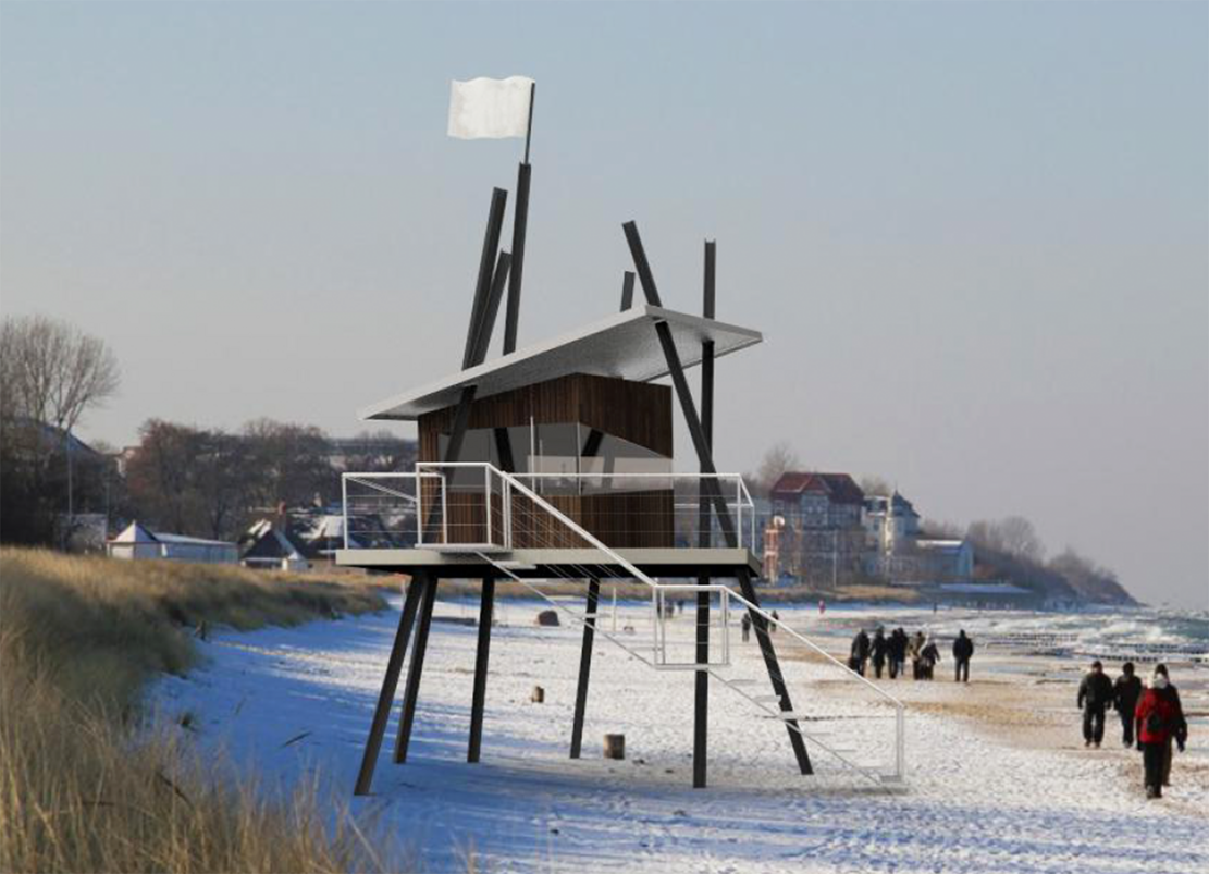 Die Lifeguard Station ist skulpturale Landmarke und architektonisches Funktionselement für das Rettungswesen zugleich. Hier trifft Dekonstruktivismus und Industriecharme auf weichen Sand und nasse Badehosen.