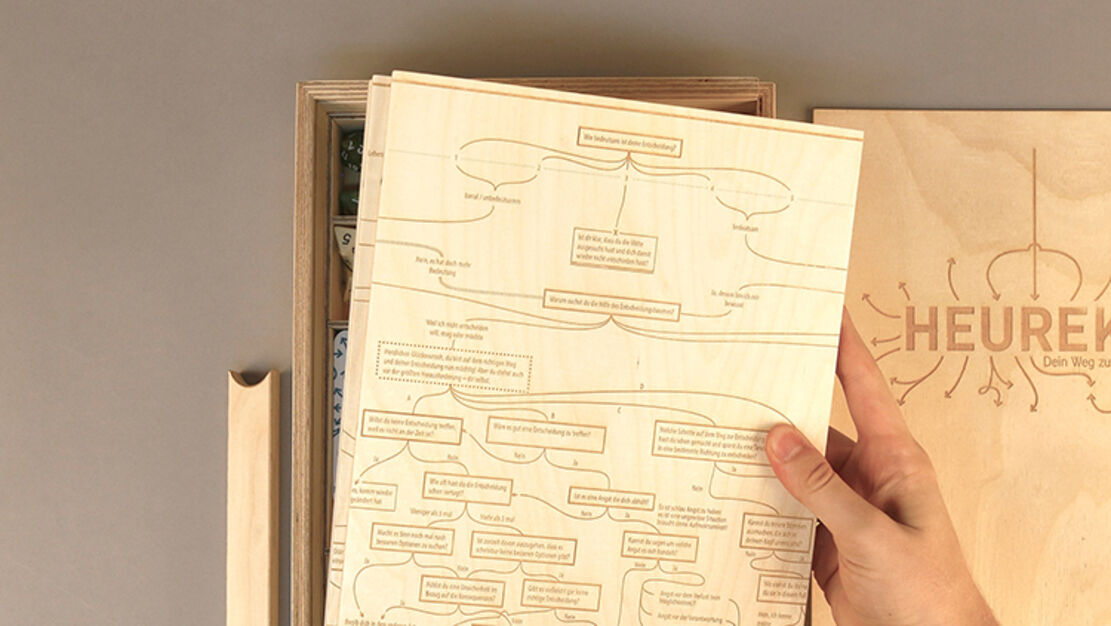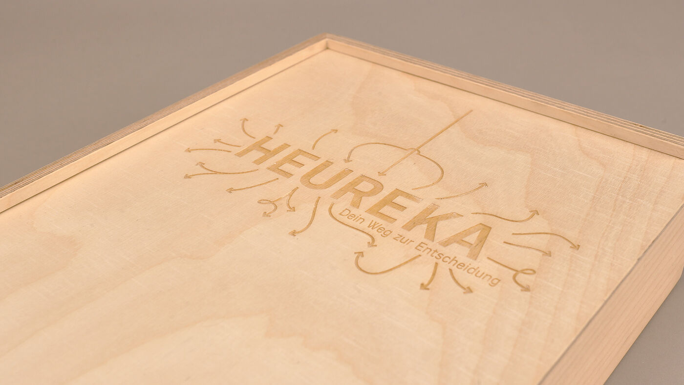 Die »Heureka-Box« enthält einen Entscheidungsbaum, der durch einen Fragenkatalog führt. Es gibt verschiedenste Zufallshelfer, wie Würfel, Kreisel und Münzen, die im Alltag auch dem schlimmsten Entscheidungsmuffel weiterhelfen. Sowie das „Heureka“-Kartenspiel, mit dem es schnell gelingt, herauszufinden, wen die Karten am Ende zum Entscheidungskönig machen.