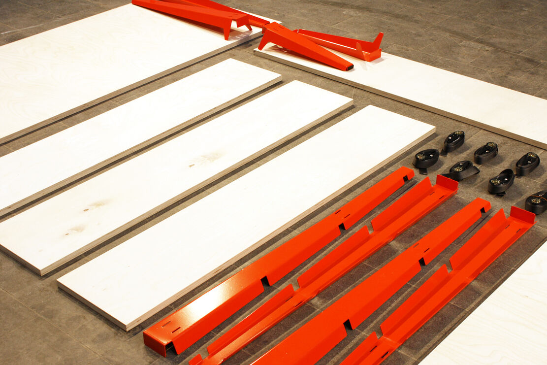 Strap-Up Philipp ist ein Möbel für dynamische Zeiten. Das System passt sich individuellen Bedürfnissen an und kann mit dem Startup wachsen. Der Aufbau erfolgt in wenigen Minuten und erfordert kein Werkzeug oder Schrauben. Die Beine aus pulverbeschichtetem Stahlblech werden einfach an eine Multiplex-Platte gesteckt und mit Spanngurten fixiert - Fertig.