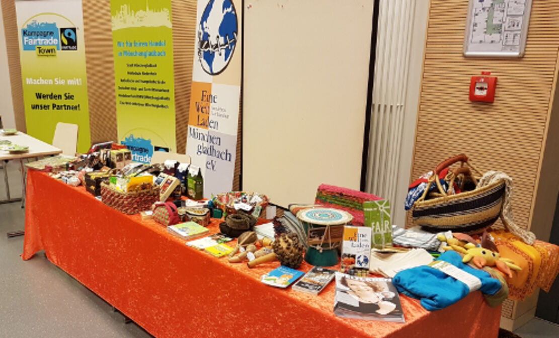 Es stellten aus: Fairquer, Rewe, Eine‐Welt‐Laden, MG Fair Trade Town, Tante LeMi, EthNa CSR Kompetenzzentrum, Katrin Pasternak/Fairtrade-Projekt FB 05 und Probeverkostung konventioneller und fair gehandelter Lebensmittel