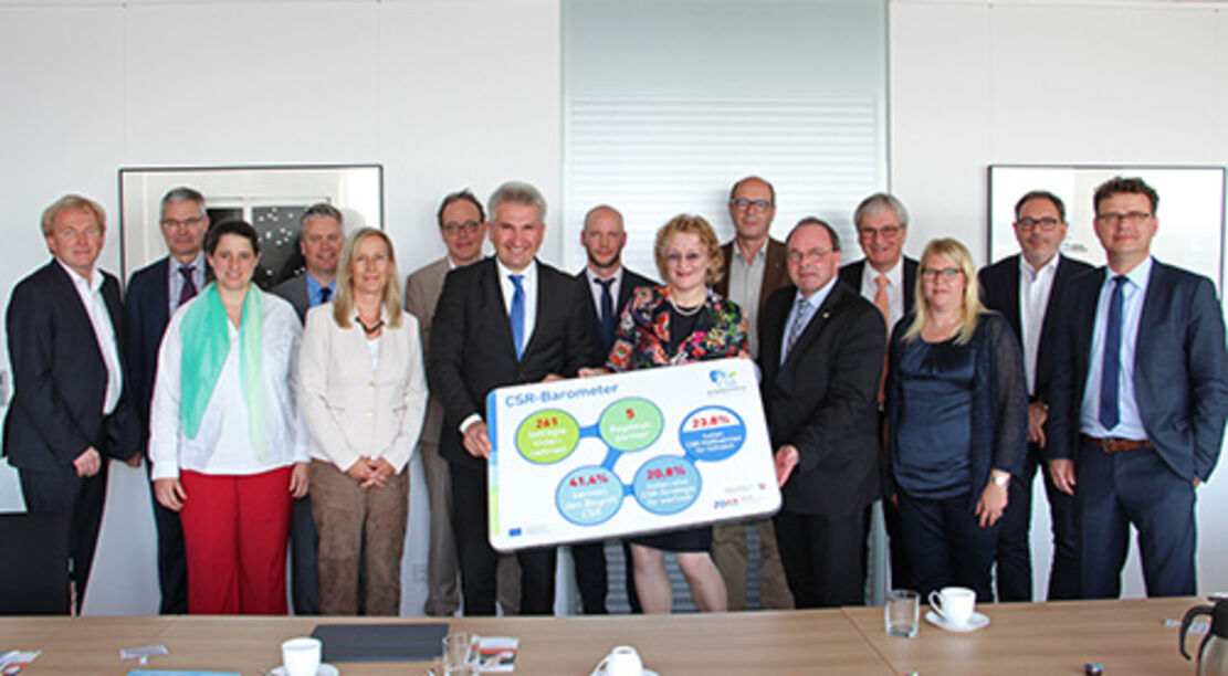Minister Dr. A. Pinkwart, Prof. Dr. R. Voller, Prof. Dr. M. Wenke und weitere TeilnehmerInnen mit dem CSR-Barometer NRW Foto: MWIDE NRW, M. Sassenscheidt