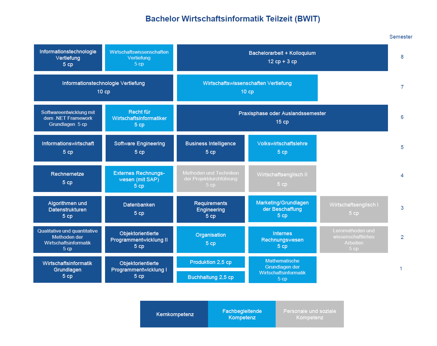 The part-time programme of study is the career-integrated version of our faculty's existing full-time degree programme. Part-time students are integrated into the existing semester groups. The Part-time Business Informatics degree programme pathway (PDF) provides a basis for orientation. A two-day university stay and three practical days in the company are planned over the course of the degree programme. The degree programme is career-integrated and is completed after eight semesters standard time to degree (in semesters).