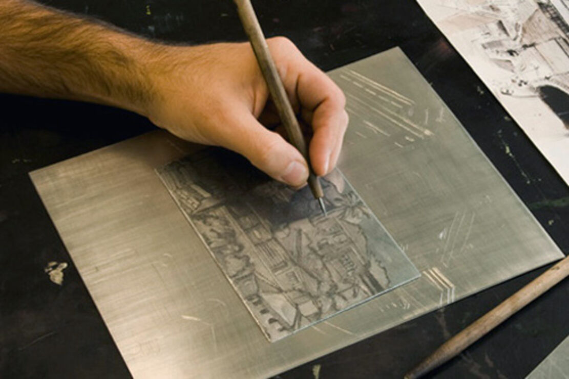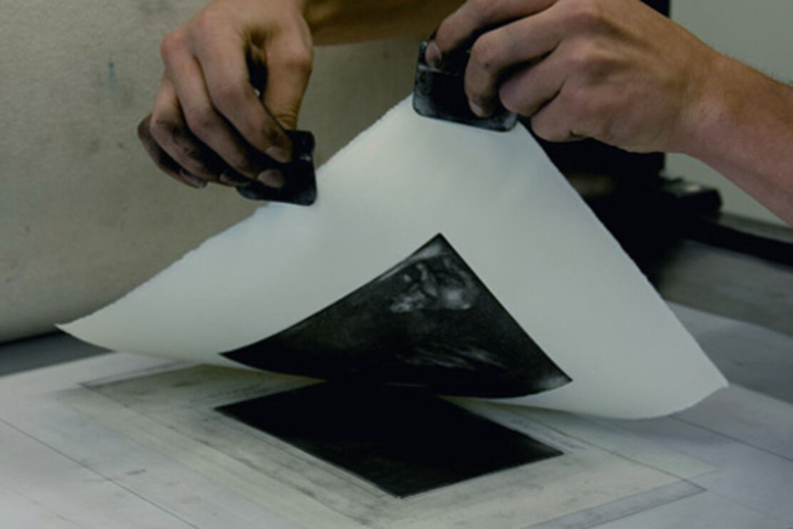 The heart of the printmaking workshop is the intaglio press: Etchings but also woodcuts and linocuts are printed here. It is possible to produce intaglio prints by hand as well as etchings. An extraction system for working with acids and various tools for creating the printing forms are available. Students have the opportunity to experiment independently in the workshop and work on printmaking projects.