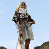 The scarv is out of the lace of a bridal dress.The upper part of the shirt is made out of a skirt of a bridal dress, the lower part is made out of a bridal veil fabric. The pants were made out of different dresses and materials whereas parts were also printed with a digital printer.