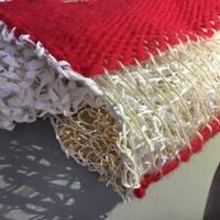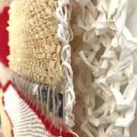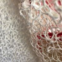 S-Polarskin, Abundance of Light. S represents Sustainability, "Abundance of Light" implies differentiated, complementary material properties. Materials such as wool, paper yarn and recycled cellophane are used with sustainability in mind. These components are connected in a woven and knitted structure as a sandwich material. The individual parts of the surface visually intertwine. The loosely knitted downside gives the material a voluminous feel and allows for air pockets. Lanolin makes it particularly water-repellent and dill, Sweden's national spice, gives it additional multi-sensory properties.