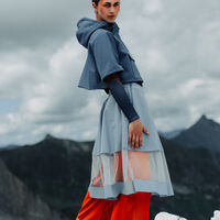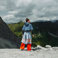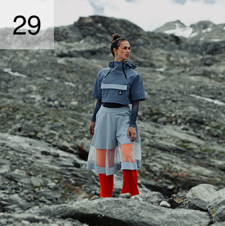 Climate change is obvious and no longer deniable. The outfit reflects the current challenges and the rapid rise in temperature. The color areas, contrasts, materiality and cut design of the outfit communicate its statement. The red-orange trousers symbolise the increase in warm years, while the orange is repeated in the top and lining of the hood. The light and dark shades of blue are reminiscent of cooler years past and contrast with the orange. The complementary contrast of orange and blue enhances the color effect and points to the urgency of the current issue. The light blue trousers over the orange ones symbolise the increasing melt water of the glaciers and cover parts of the orange trousers. The transparent insert reinforces this impression and allows the contrasting colors to merge. This fusion symbolises the inexorable progress of global warming. The graphene structure on a blue background in the longsleeve and under the sleeves of the hooded T-shirt shows how the warmth spreads from the bottom to the top and threatens to displace the last cold phases. The combination of softshell and tulle creates a further contrast that supports the outfit's statement and evokes associations with a warmer environment. The color scheme, shapes, lines and cut design of the outfit highlight the current problem of climate change.
