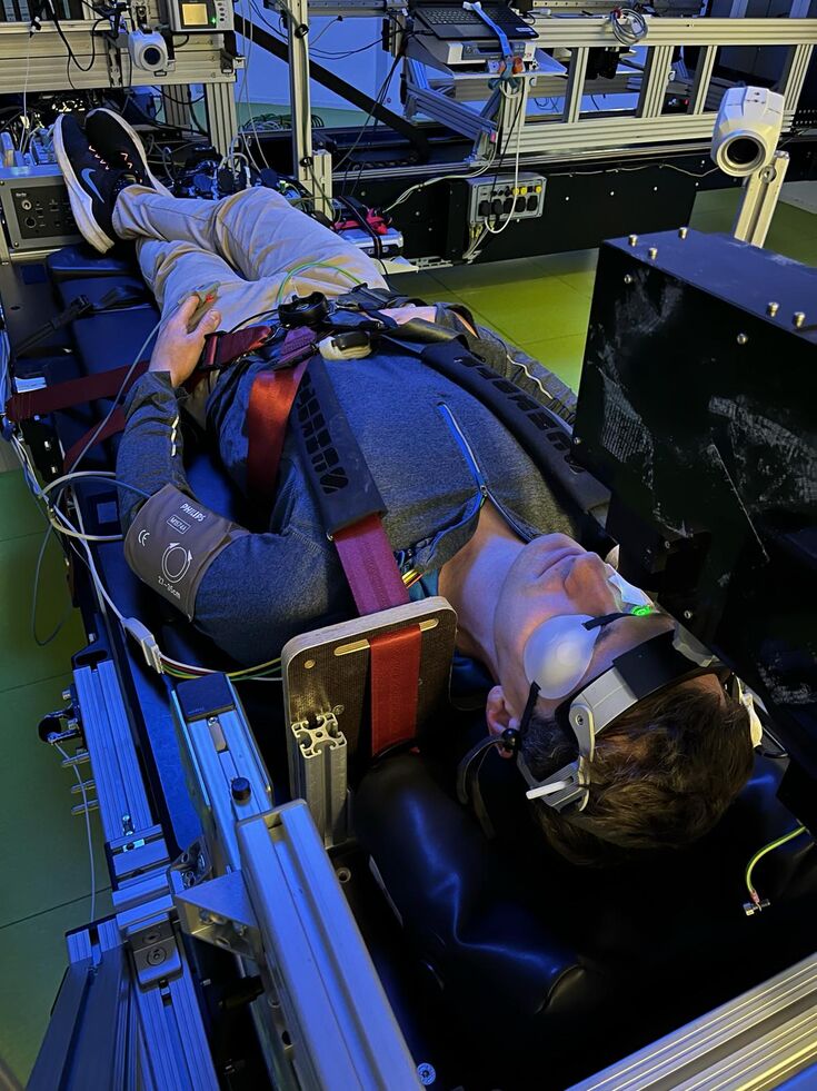 Dr. Lukas Streese is part of a research group at Düsseldorf University Hospital that aims to investigate the effects of gravitational changes on microcirculation. Astronauts who spend long periods in space face the problem of developing visual impairments. The cause of the so-called "spaceflight-associated neuro-ocular syndrome" (SANS) is not yet known. The "Retinal circulation during gravitation changes in a human centrifuge" (RIDGE) project, led by Prof. Christian Jung from the Department of Cardiology at the University Hospital in Düsseldorf, is trying to get to the bottom of the causes of microvascular changes in the eye. This project also aims to test possible forms of therapy that can reduce the negative effects of space travel on vision. Dr. Lukas Streese is part of the research team that was able to raise €600,000 in funding for this project. Mr. Streese will contribute his expertise in retinal vascular diagnostics to this project. Mr. Streese has already carried out the first trial measurements with the research team (see images). The aim is to measure the retinal microcirculation at different g-forces during the rotation of the centrifuge. The aim is to compare different body positions. The RIDGE project is a great example of how the Tandem Niederrhein project enables interdisciplinary collaboration.