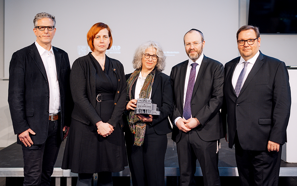 University President Susanne Meyer also addressed the obligation of educational institutions to communicate the fundamental values of democracy in a sustainable way. She told the story of Rudolph S. Jacobs. The Jewish boy was a pupil at the Krefeld Weaving School, a predecessor of today's university. He managed to flee to America via Holland, but spent weeks in solitary confinement during his escape and lost his parents - they were murdered in a concentration camp. The university president was visibly moved as she read from a letter that Rudolph Jacobs wrote to Jasmin, a student from Krefeld, in the 1980s. Jacobs told her how he froze in fear when a new teaching education teacher in a black SS uniform entered the classroom. Despite the uniform, he turned out to be a fair instructor and Jacobs assured Jasmin: "I believe in the fundamental goodness of people". For Meyer, "a moment in which education briefly halted barbarism".