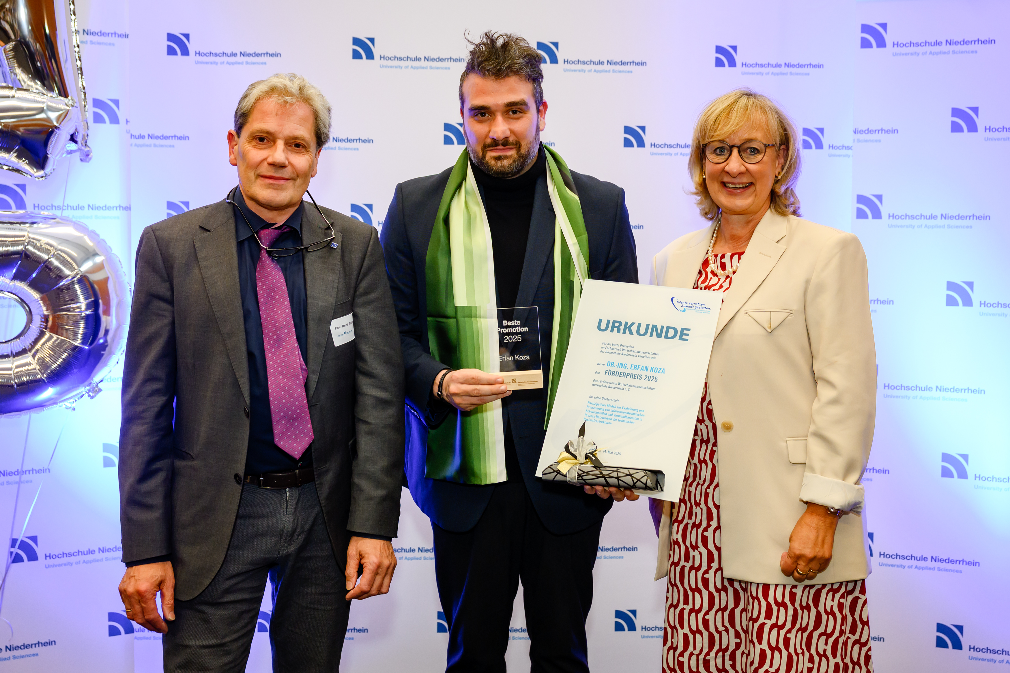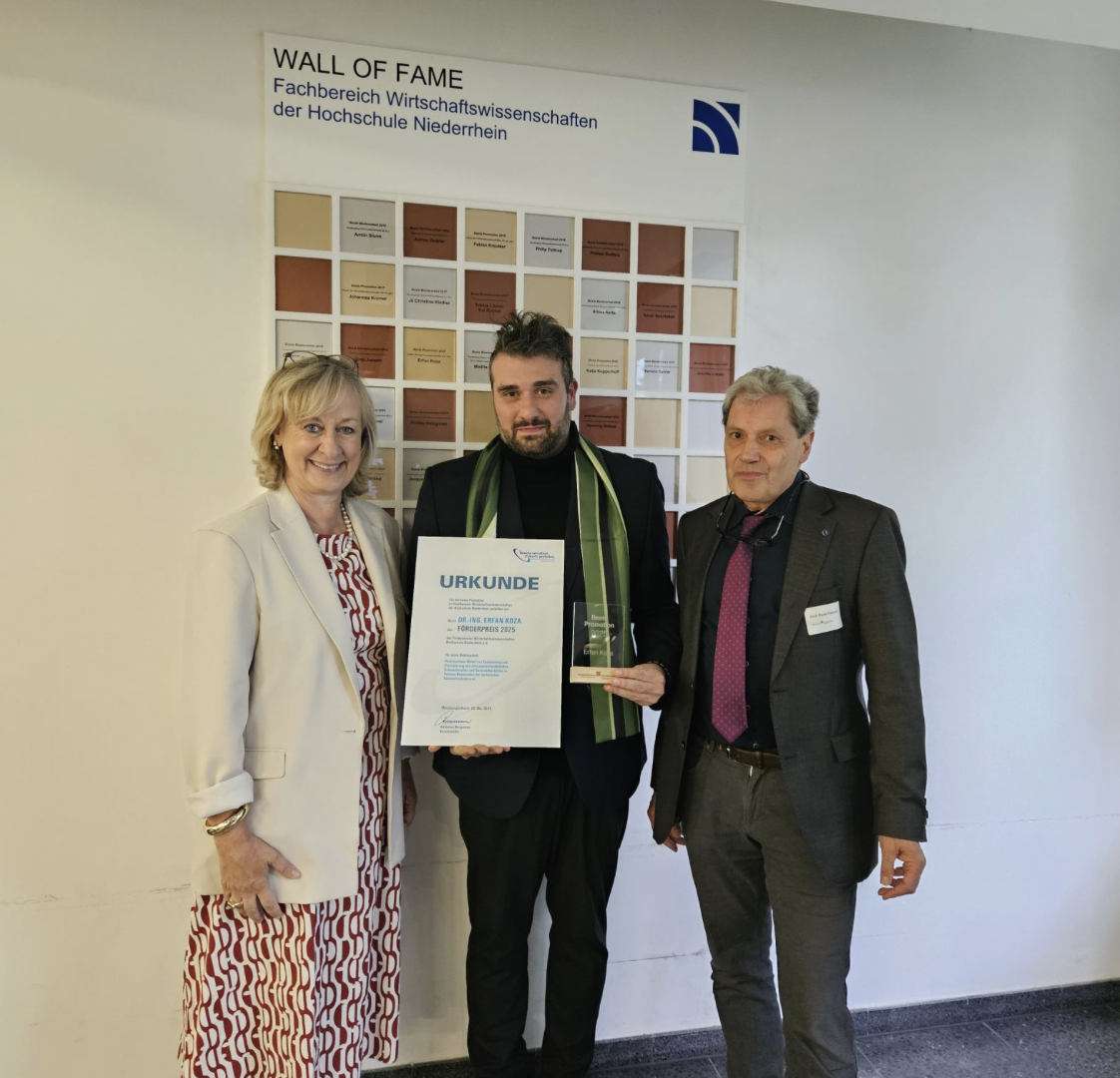 At the graduation ceremony of the Faculty of Business Administration and Economics at the Hochschule Niederrhein, Dr Erfan Koza received the prize for the "Best Doctorate 2025" of the Hochschule Niederrhein. He is also guaranteed a place on the Wall of Fame of the support association of the Faculty of Business Administration and Economics.