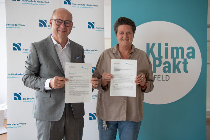The Hochschule Niederrhein and the city administration have jointly signed the climate protection agreement of the Krefeld Climate Pact. This means that the university is now not only the initiator of the climate pact, but also a climate partner. Dr. Thomas Grünewald, the university's president, signed the agreement on behalf of the university, while Sabine Lauxen, Krefeld's head of environmental affairs, signed the agreement on behalf of the city. The university is also one of the initial partners that launched the alliance with the city of Krefeld. Together, the path to climate neutrality is now to be filled with life. The Hochschule Niederrhein defines climate neutrality as a lead project in its sustainability strategy and wants to prioritizeCO2-saving measures.