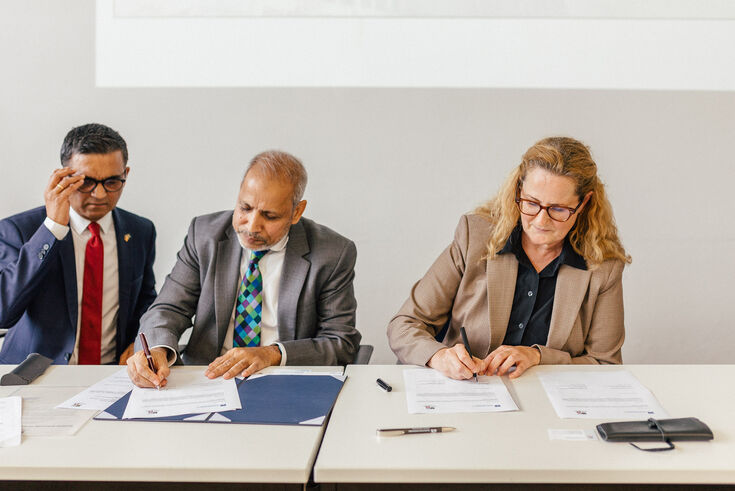The Faculty of Textile and Clothing Technology at the Hochschule Niederrhein has been working closely with cooperation partners from Asia for many years. Now the cooperation with a partner is further intensified. A Memorandum of Understanding (MoU) was signed with representatives of the BGMEA University of Fashion & Technology (BUFT) in Dhaka/Bangladesh on Wednesday afternoon. Hasnat Mia, Honorary Consul of the People's Republic of Bangladesh and BUFT Goodwill Ambassador, also attended the ceremony in Mönchengladbach and signed the agreement.