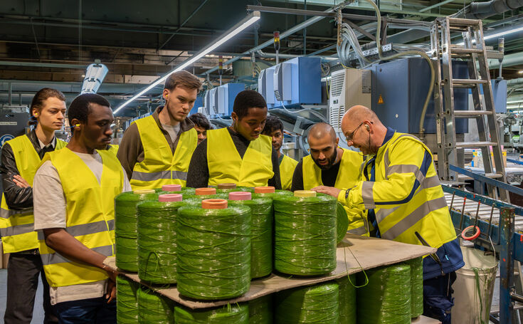 The starting point was the Krefeld South Campus, from where they travelled to Polytex Sportbeläge-Produktions-GmbH in Grefrath. The company opened its production halls and showed how modern sports and floor coverings are made. The students were able to get an idea of everyday working life and talk to specialists.