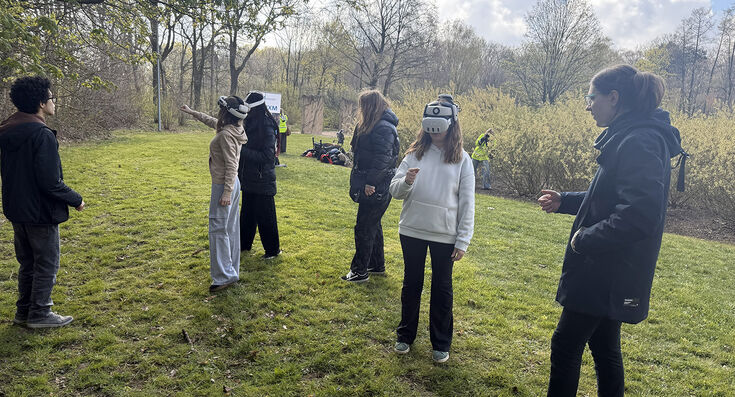 The project focuses on an interactive extended reality (XR) serious game that conveys environmental knowledge in a playful way and promotes sustainable behaviour. The game is played using Meta Quest glasses, which augment virtual objects such as rubbish, animals or plants into the real environment. A 6th grade class from the Realschule an der Niers recently completed a first practical test in the Rheydt city forest. Together with the character "Max the Bee", the pupils played various sequences in which they had to collect rubbish virtually and separate it correctly. They received points and virtual rewards for successfully completing the tasks. Parallel to the digital learning experience, some of the class took part in a real rubbish collection campaign in the city forest. In this way, virtual learning was directly linked to practical environmental protection.