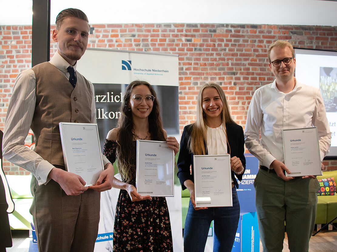 Jedes Jahr wird der Tutorenpreis samt Urkunde und Sachpreis verliehen. In diesem Jahr hat sich die Jury für den Textil- und Bekleidungstechnik-Studenten Marc Küperkoch (Fachtutorium), die angehenden Wirtschaftswissenschaftler:innen Jennifer Lies und Ruben Lamers (Team-Tutorium) sowie Oecotrophologie-Studentin Annete Repp (Erstsemestertutorium) entschieden. Chemiestudent Cedrik Dauenheimer, der bei der Verleihung nicht persönlich dabei sein konnte, erhielt den Sonderpreis.