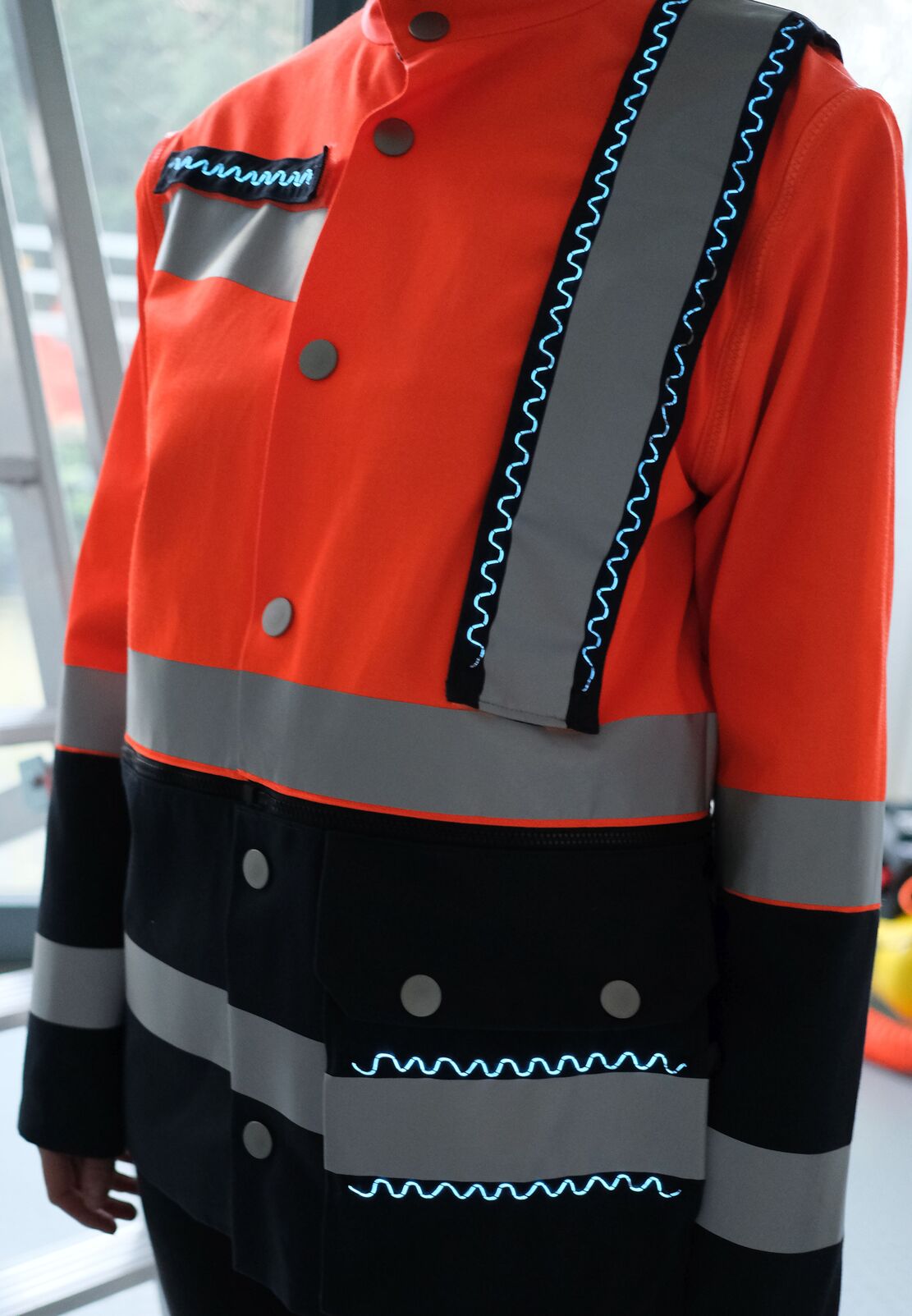 The aim of the SmartSeam project (IGF project 09689/19) is to utilise seams for functional integration in garments. Using a combination of conductive materials and other functional threads, sensors and actuators can be incorporated into a textile without an additional processing step by means of crossing and interlacing points in the seam. To achieve this, a lockstitch machine with two separate thread laying units is used. A modular protective waistcoat with integrated optical filaments has already been realised to increase the wearer's visibility. Demonstrators with integrated movement and body physiological sensors are also being developed. The project is being carried out in cooperation with the University College Ghent (Belgium) and is funded by the AiF as part of the programme for the sponsorship of joint industrial research IGF by the Federal Ministry of Economics and Climate Protection.
