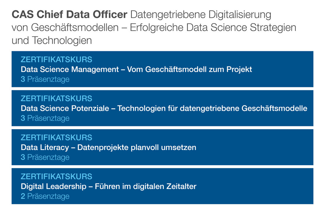 The ONLINE Certificate Program(CAS) "Chief Data Officer" provides you with the foundation courses and competencies to successfully design, implement and lead the digitization of business models. You will learn to use Data Science technologies in a targeted manner using state-of-the-art methods, processes and tools.