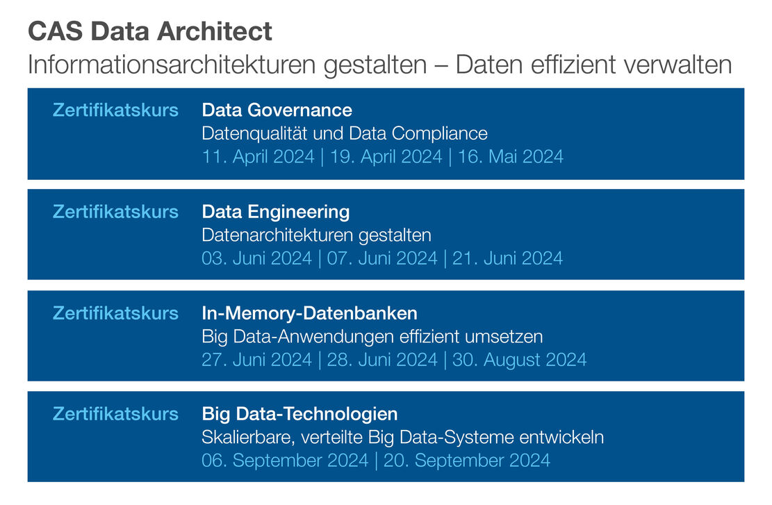 In the ONLINE certificate programCAS Data Architect, the technological, organizational as well as legal aspects of comprehensive information management are addressed in four consecutive certificate courses. It is aimed at specialists and managers who want to take on the role of a "Data Architect" in the company. As such, they are responsible for the technical architecture and selection of data management systems as well as for the organizational design of information processes.